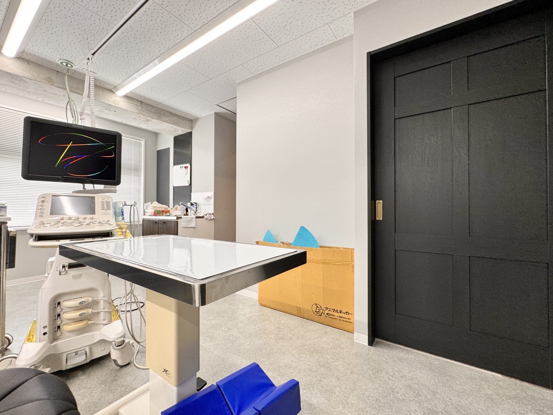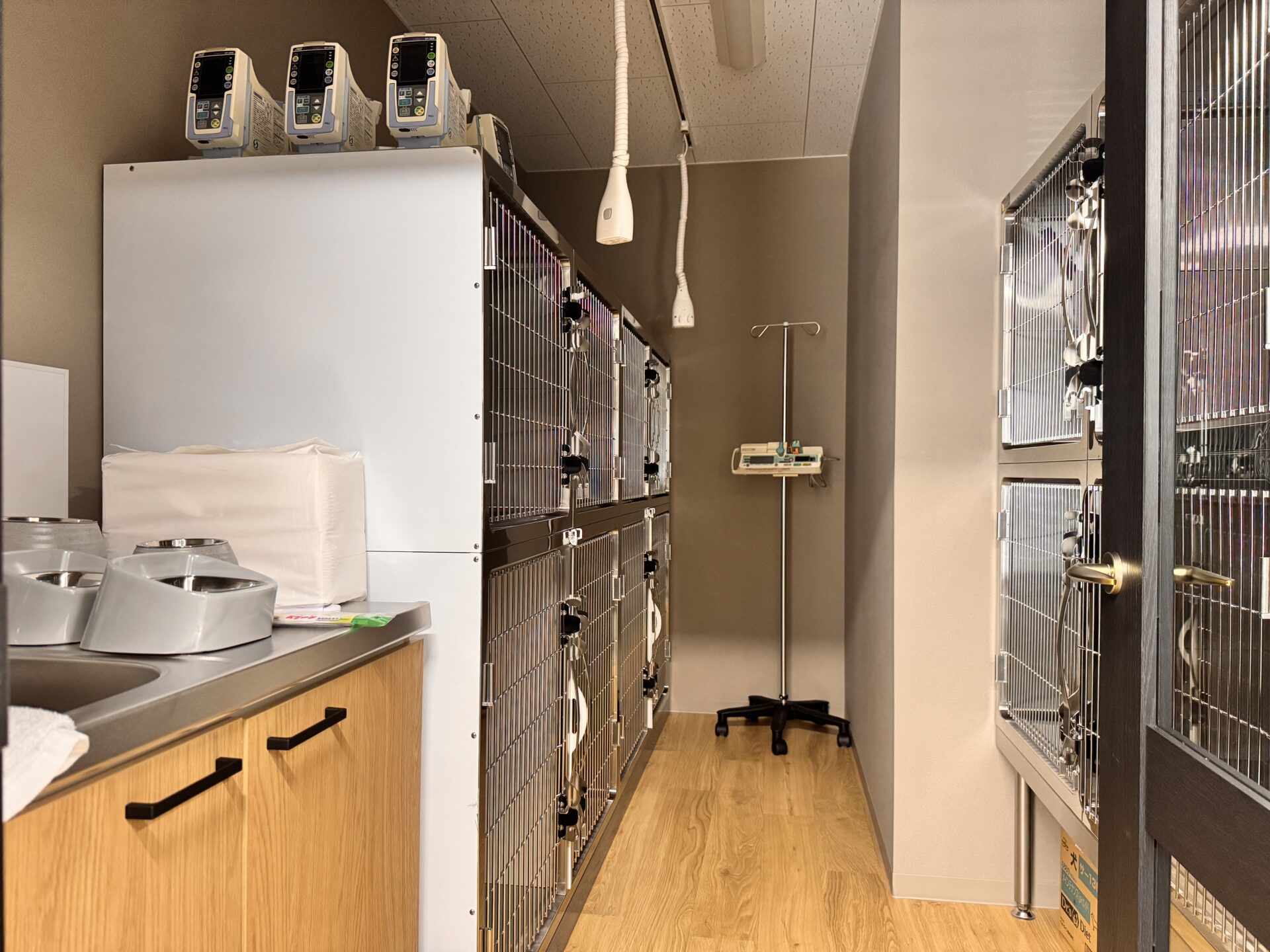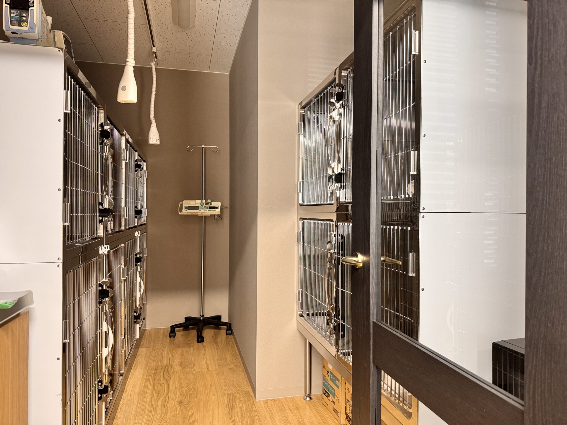 犬舎室の扉は、処置室から室内の様子が見えやすいよう、おおきな透明ガラスの入った扉デザインにしました。