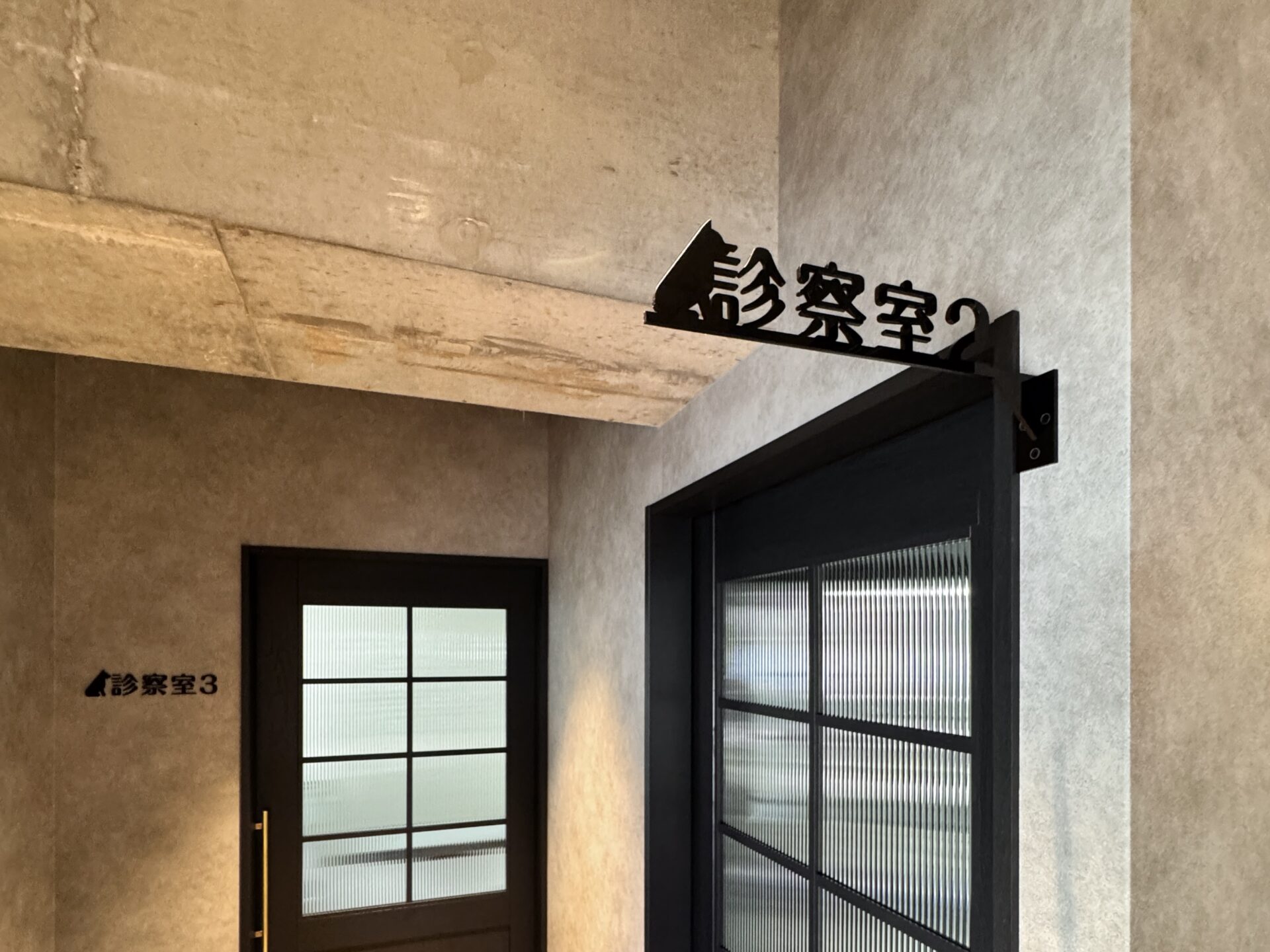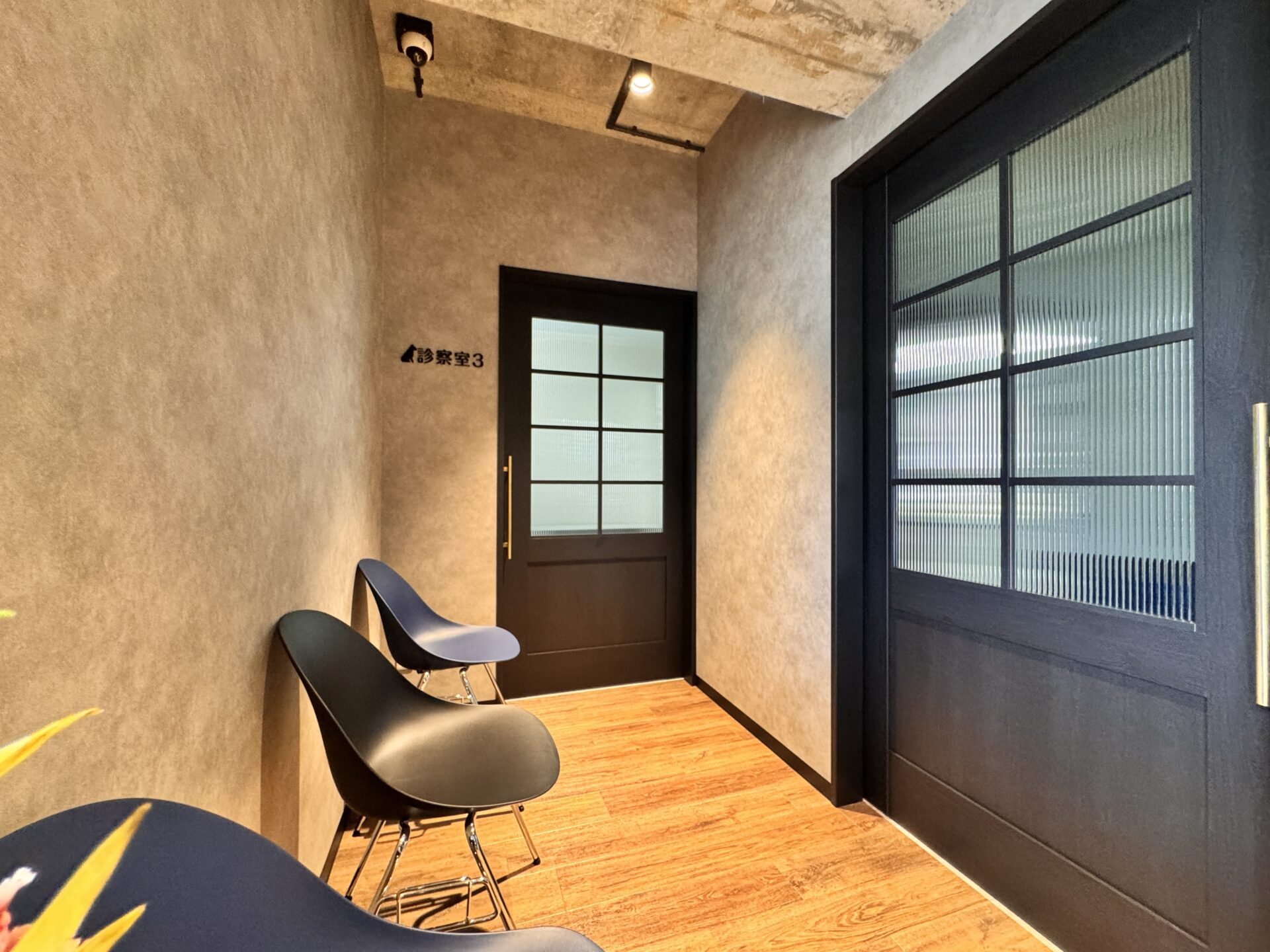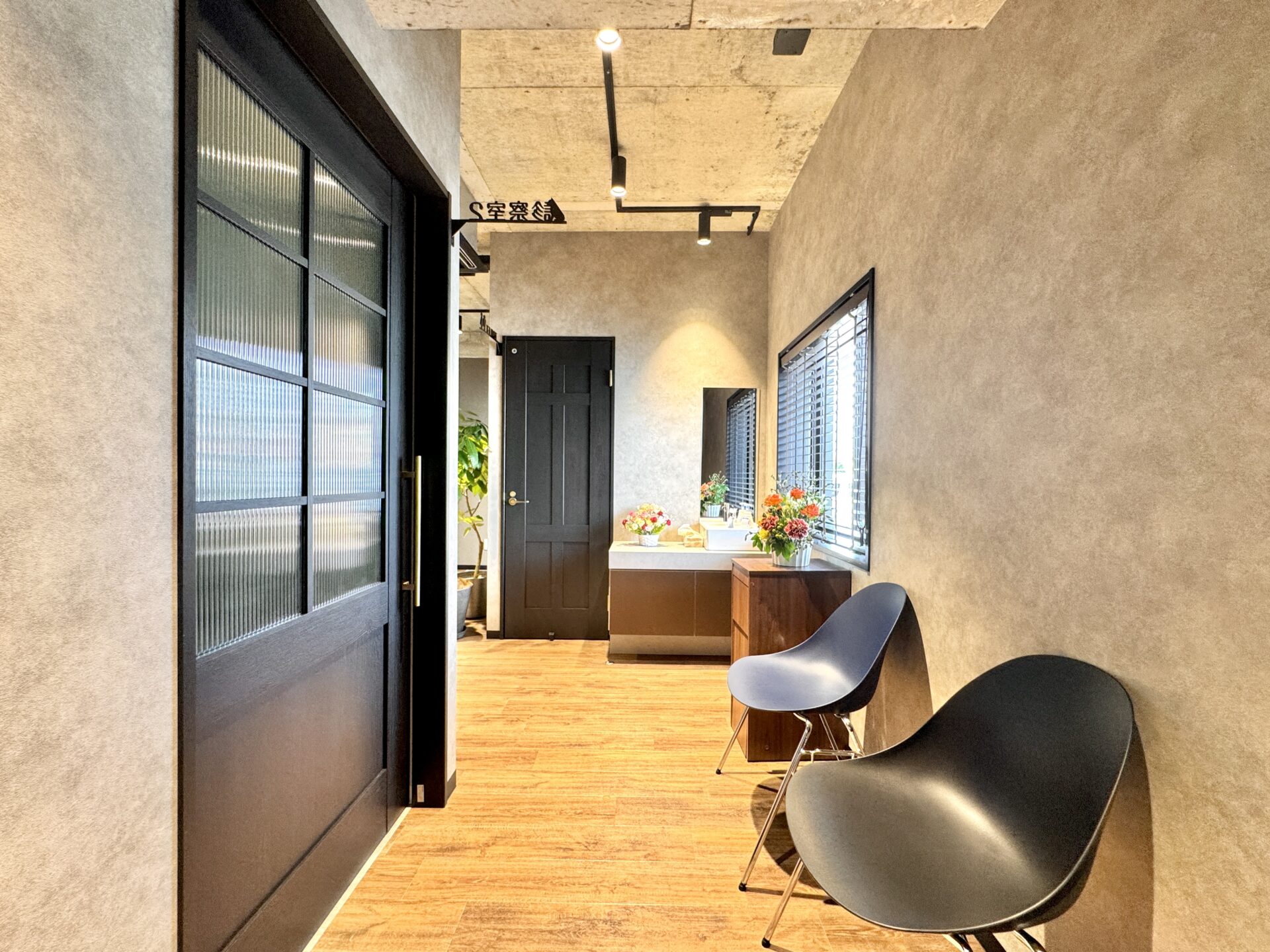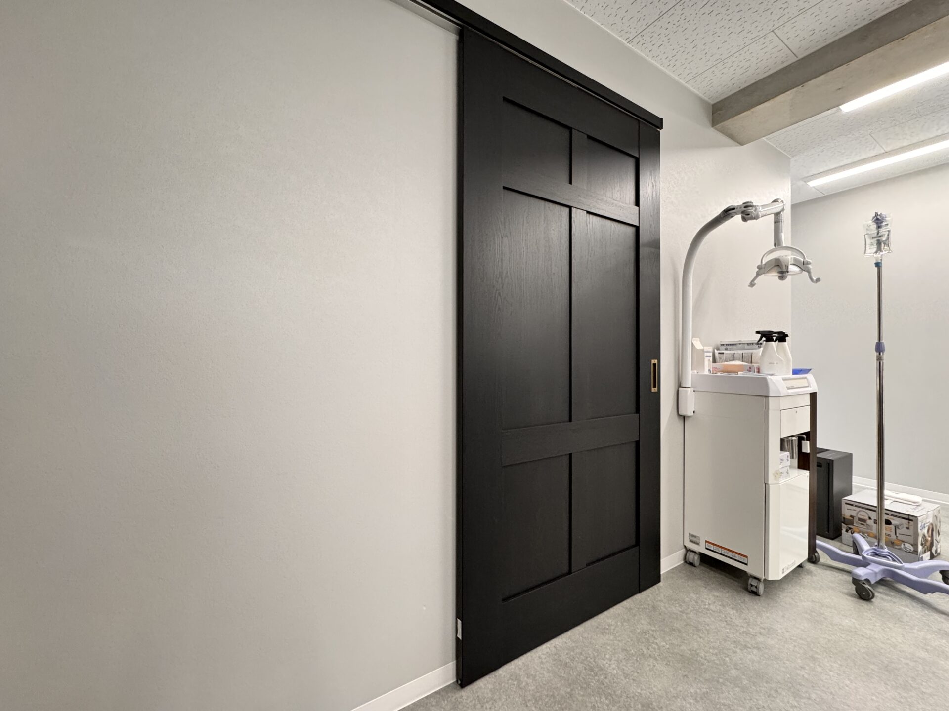 診察室の扉はブラック色の框戸になっており、ウェイティングの空間引き締めるオシャレなデザインです。