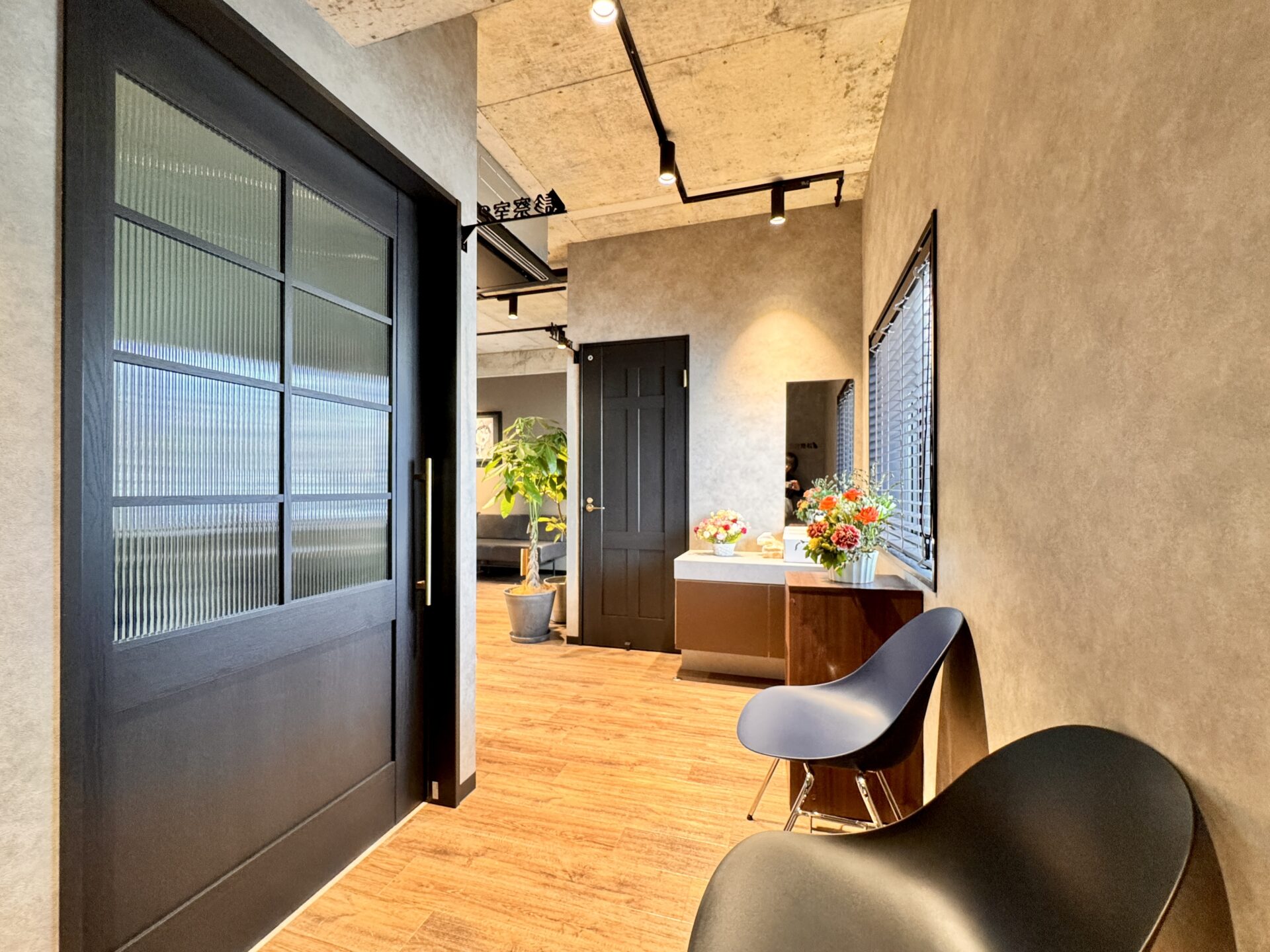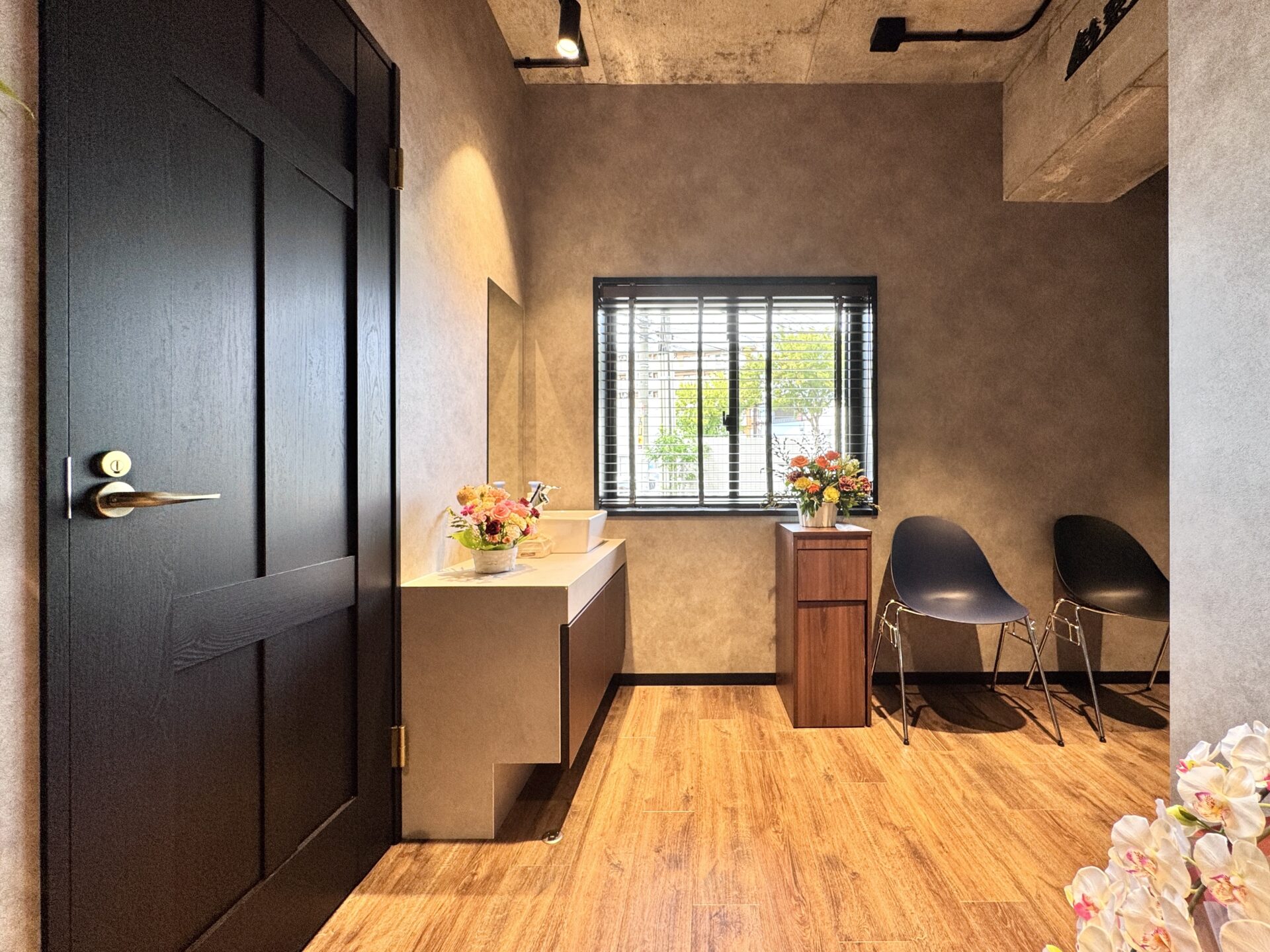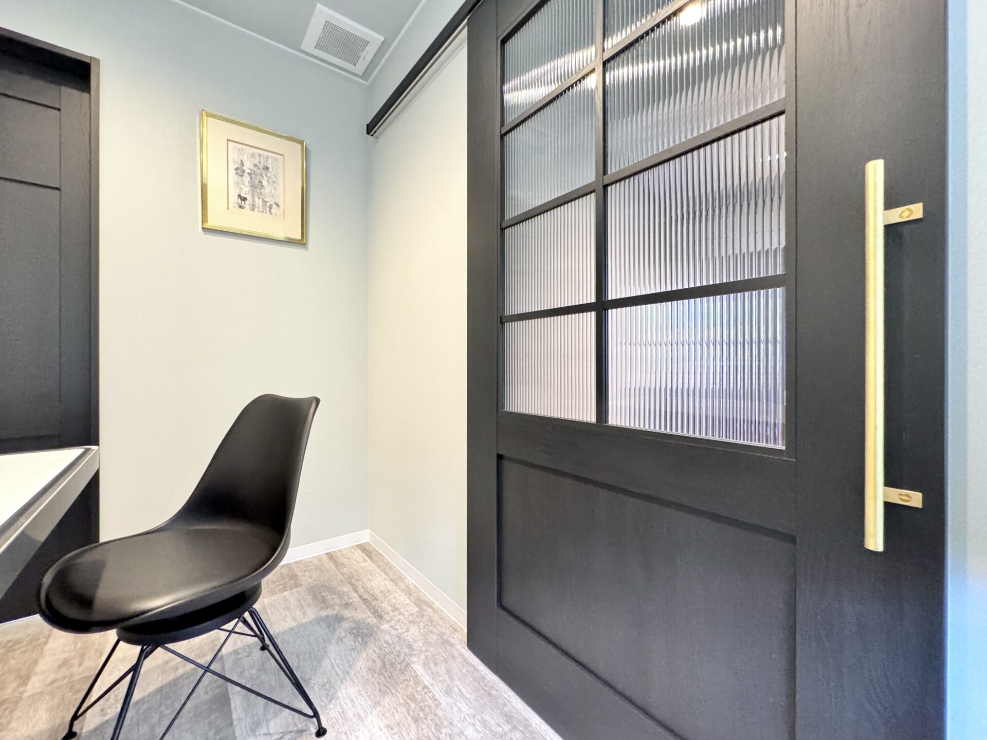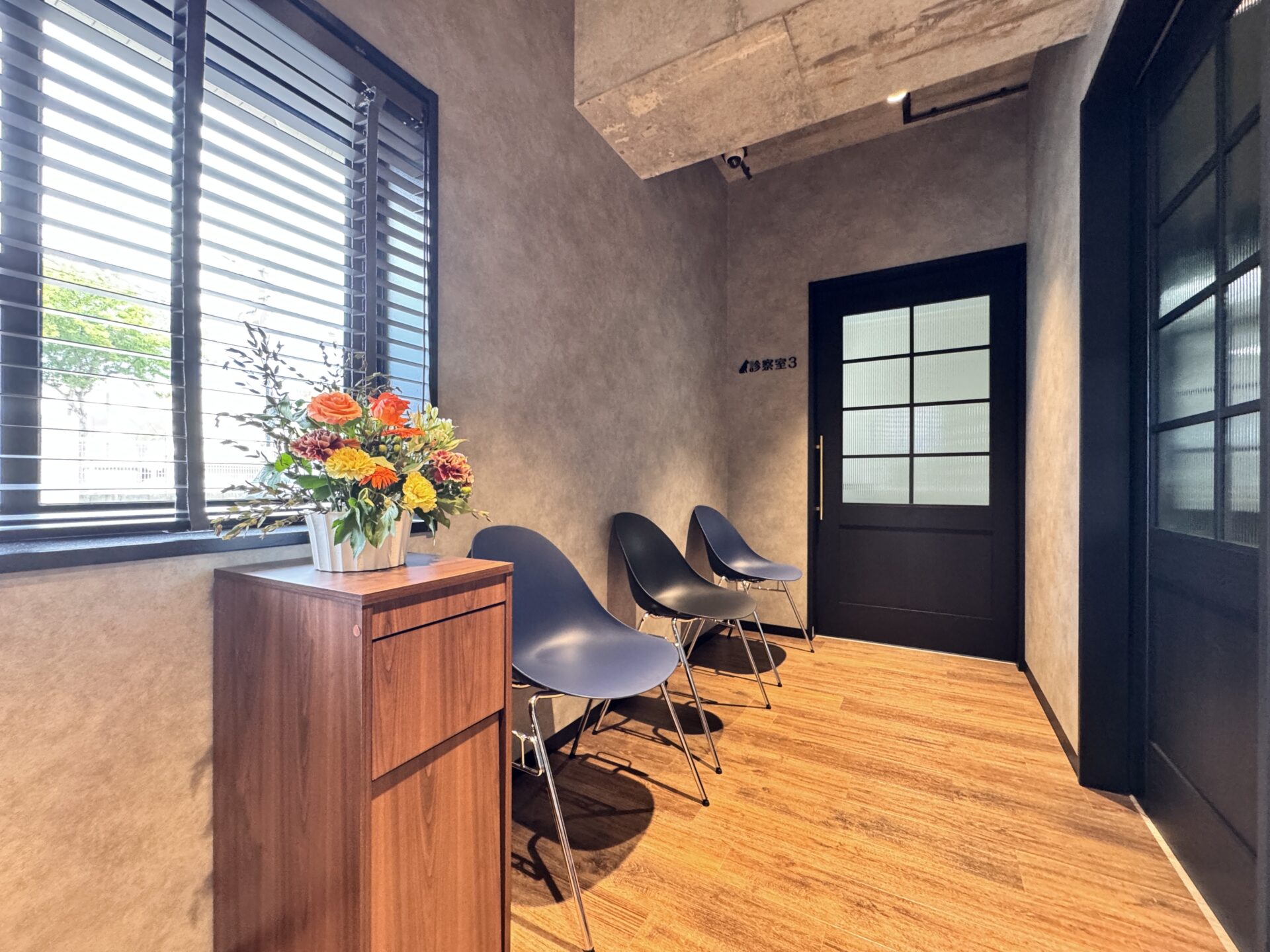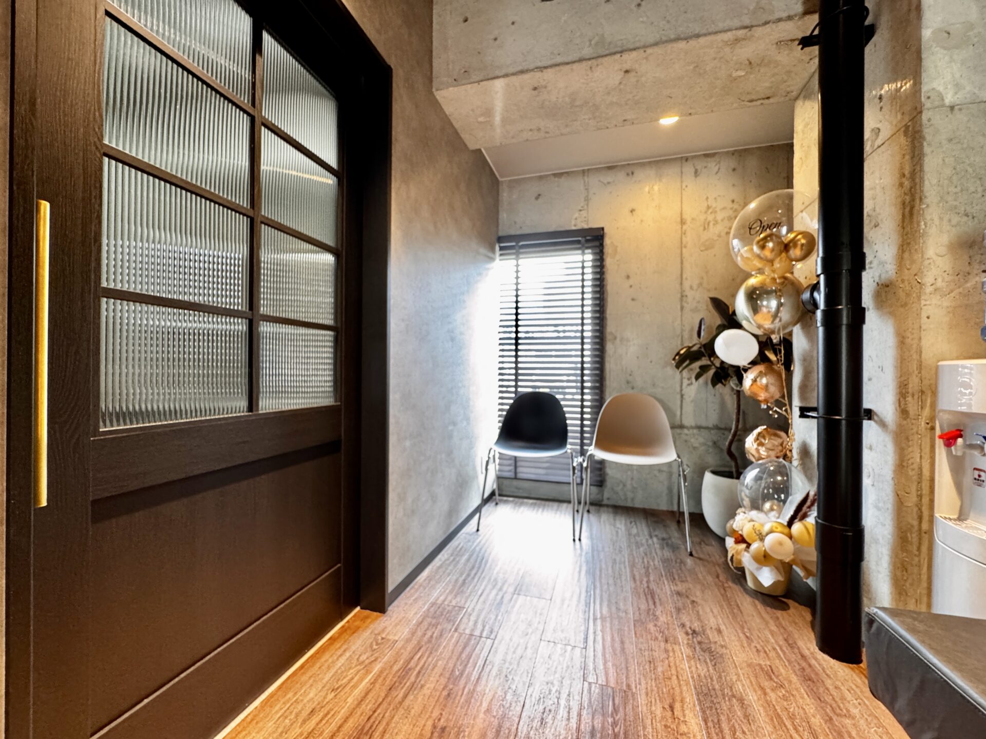 診察室の扉はブラック色の框戸になっており、ウェイティングの空間引き締めるオシャレなデザインです。