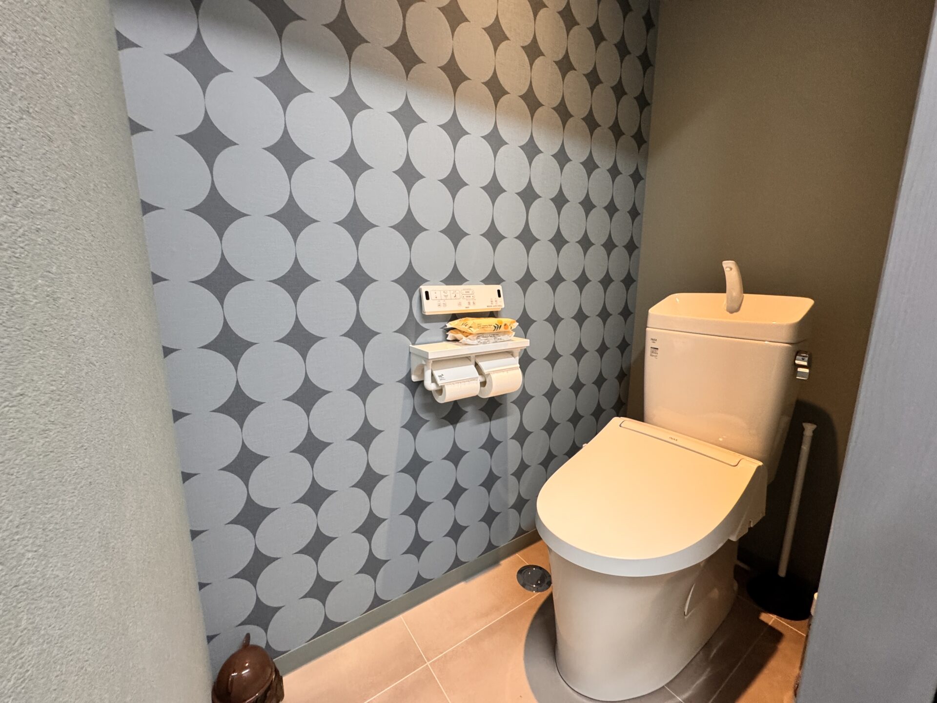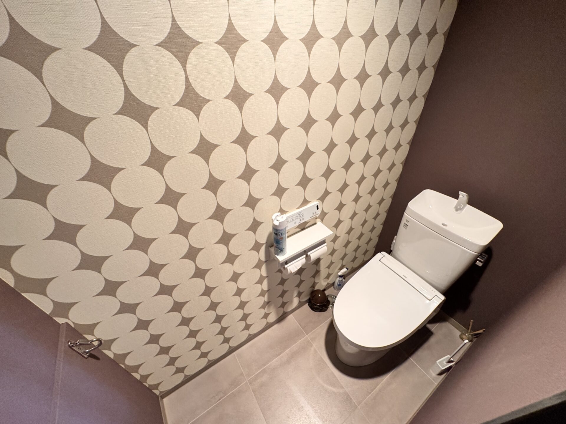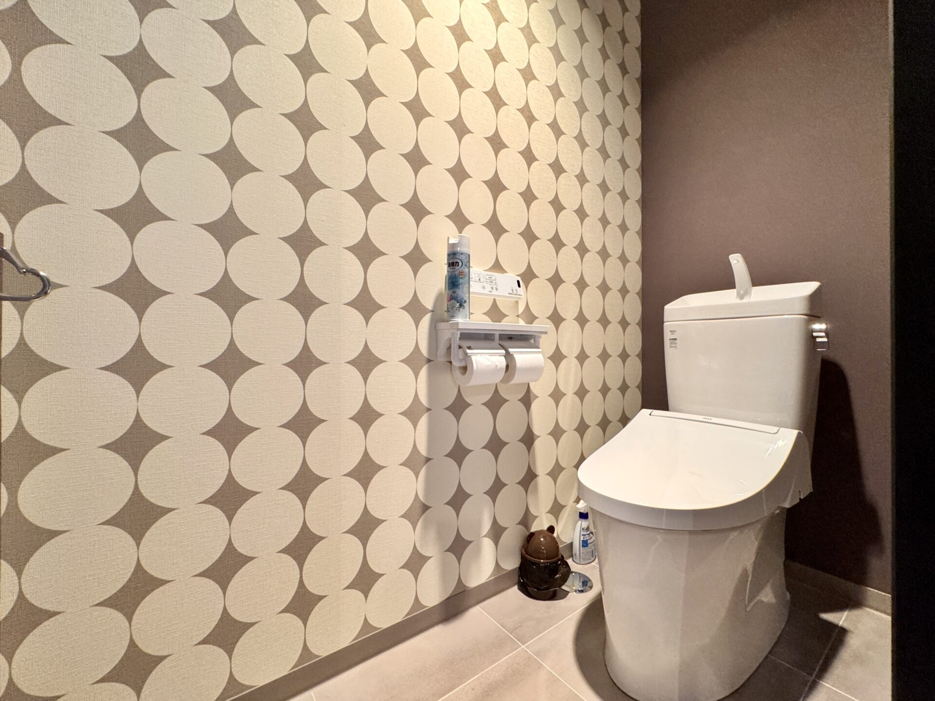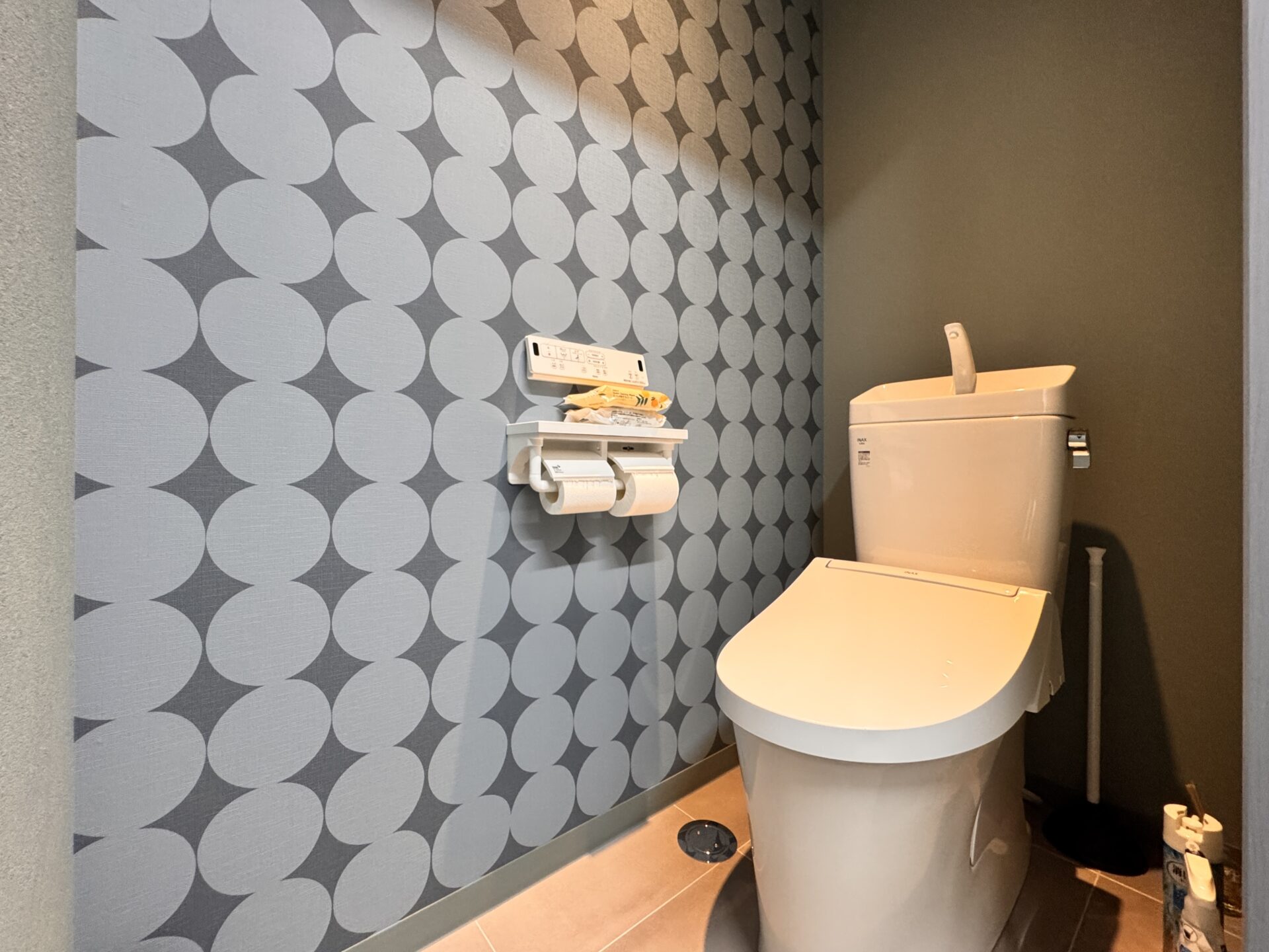 お客様用トイレと同様に、スタッフ用トイレの室内の壁紙は汚れが付きにくく、消臭・抗菌機能のあるクロスです。