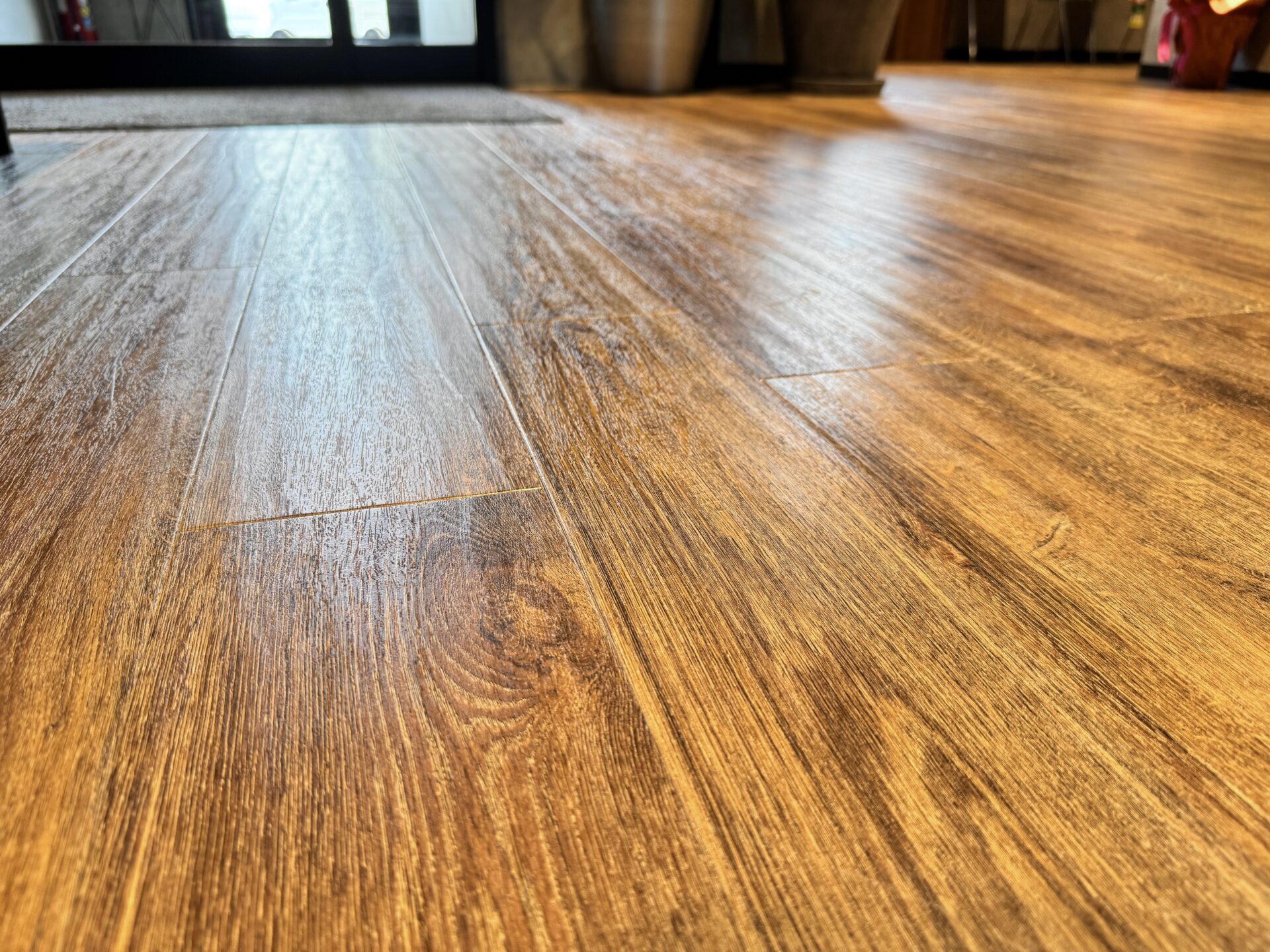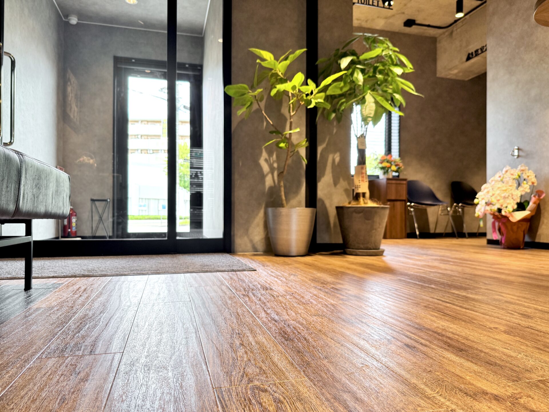 木目の床材は塩ビタイルになっており、表面のエンボスの効いた防滑性のある商品です。