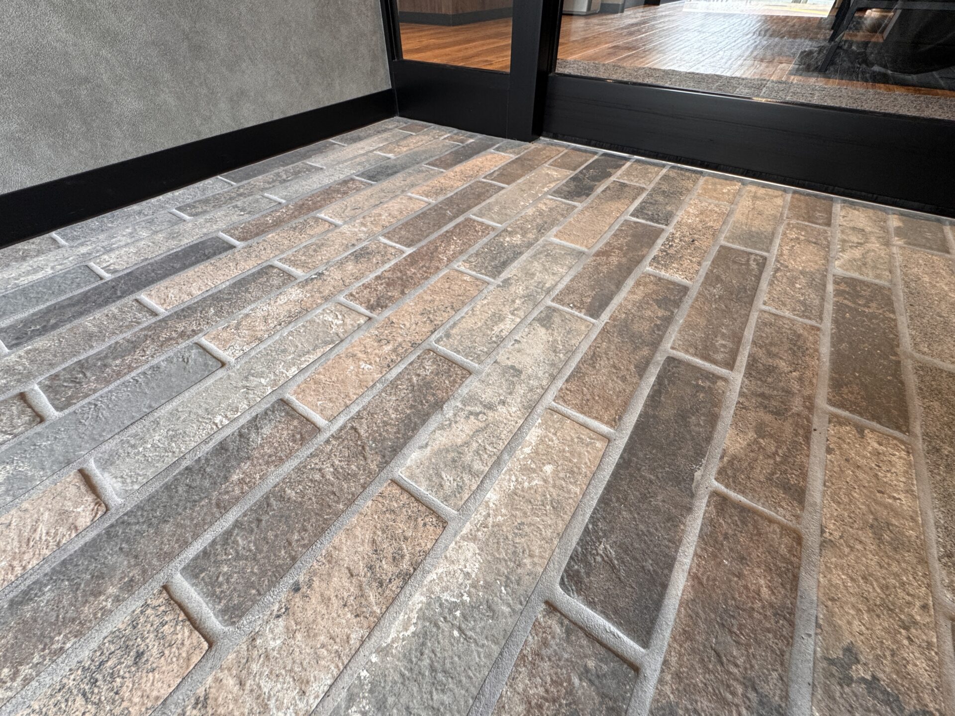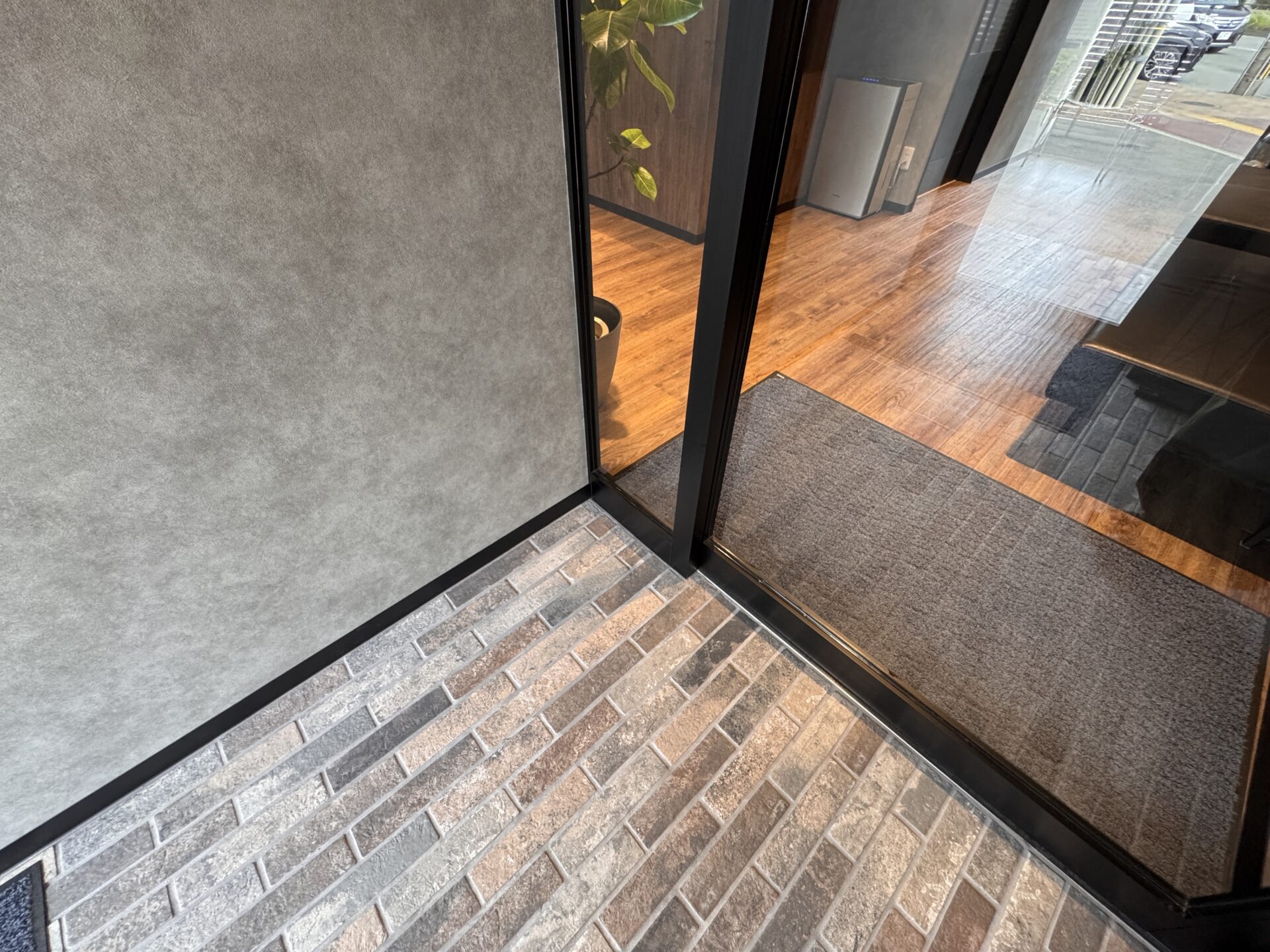 玄関から風除室までの床はブリックタイルになっており、ブルックリンスタイルを表現しました。