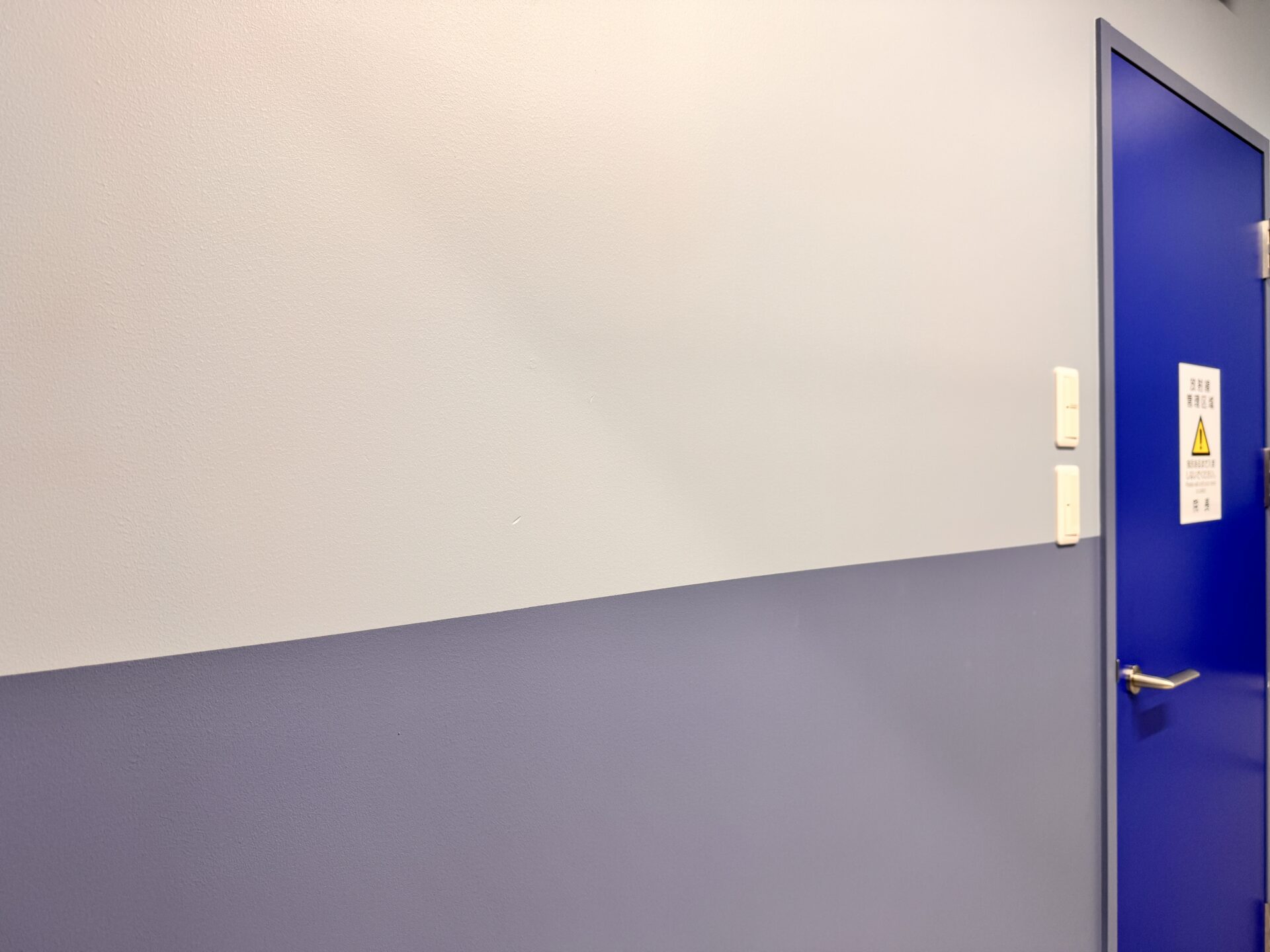 レントゲン室につながる扉は、オペ室側はブルー色、手術室側はホワイト色と面材を分け、