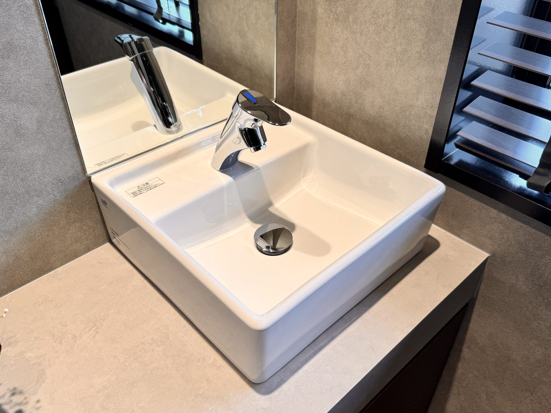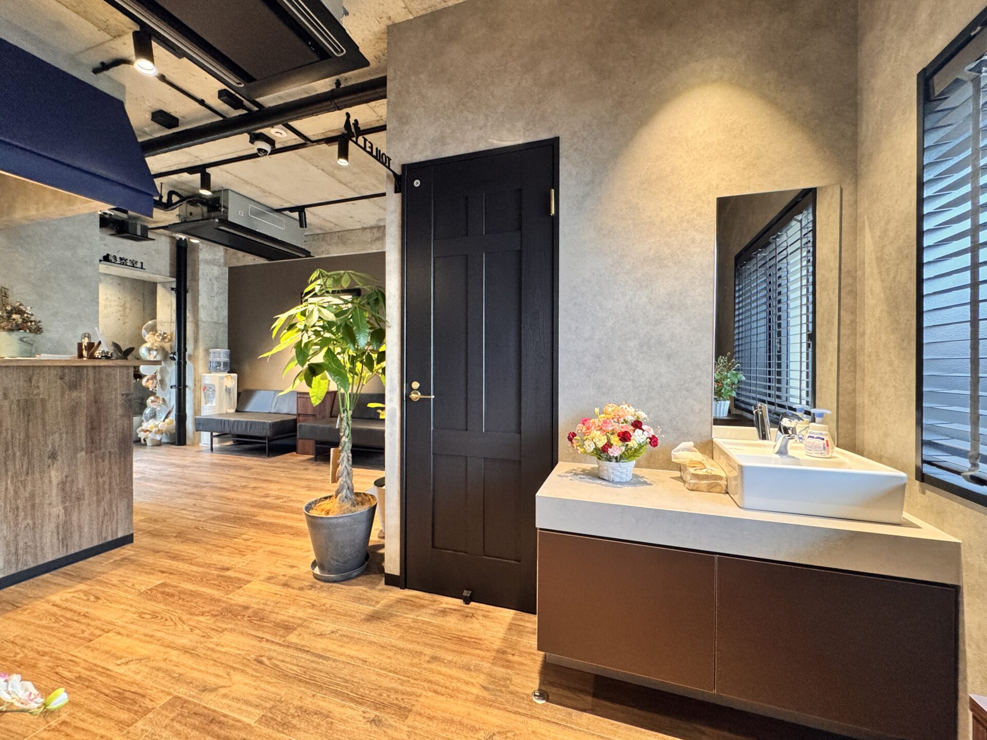トイレの外にある手洗いスペースはモルタル調とレザー調を組み合わせた、素材感のあるレトロなデザインです。